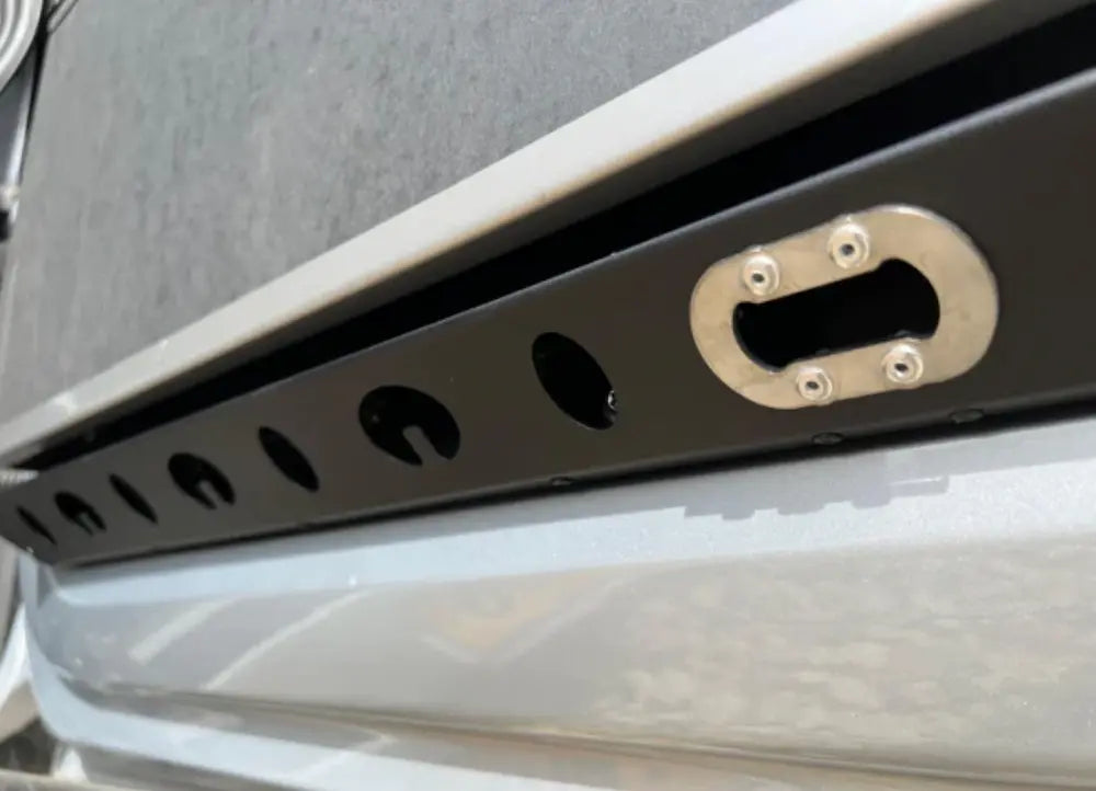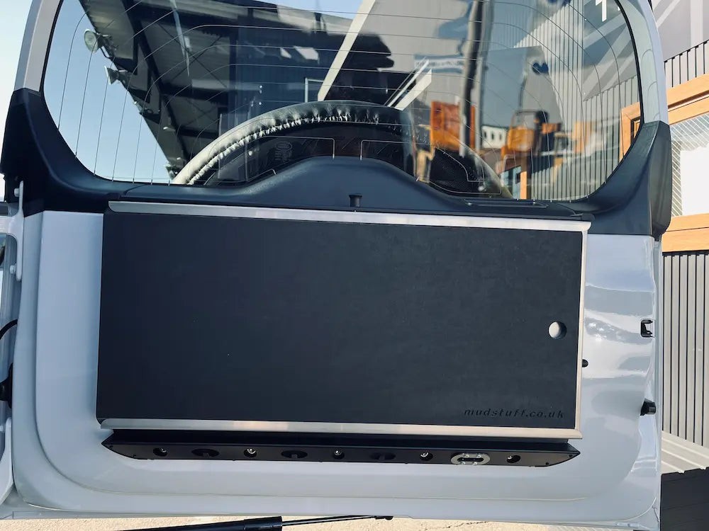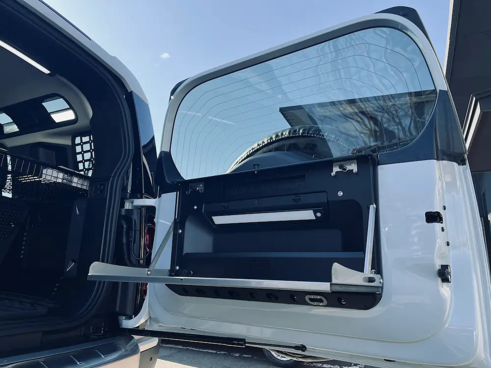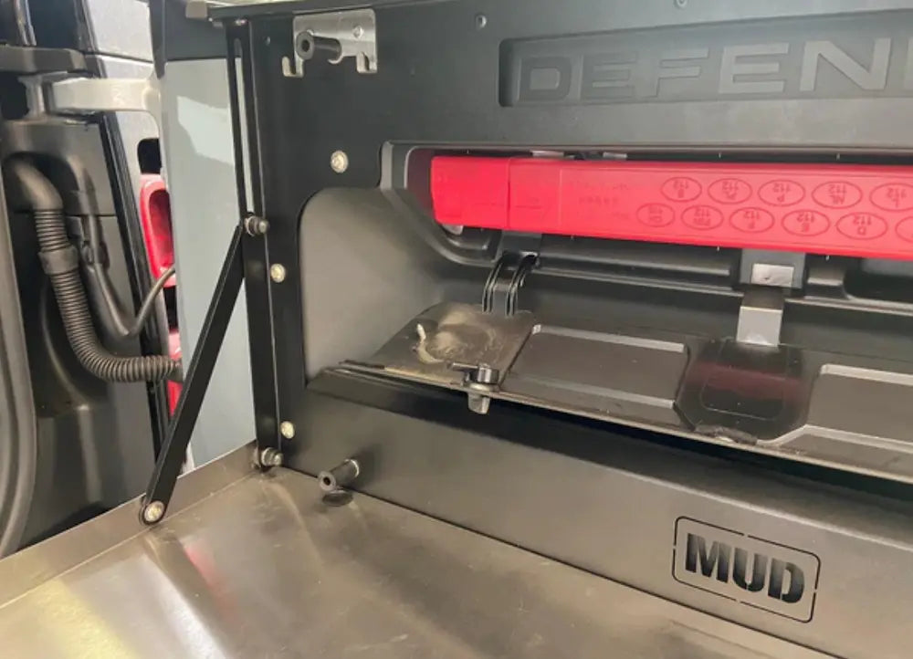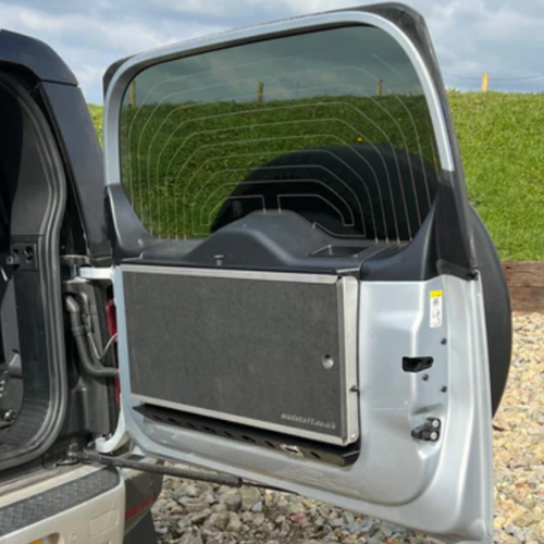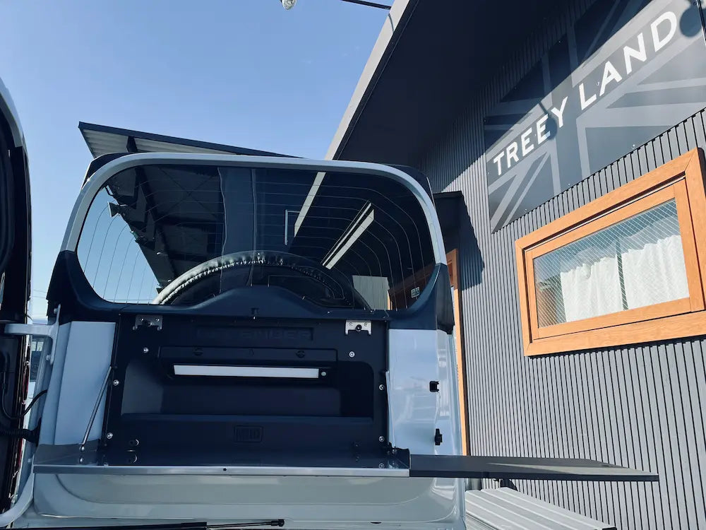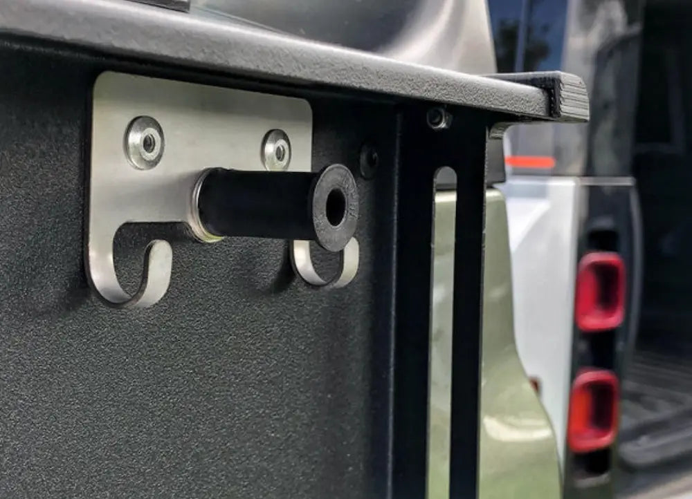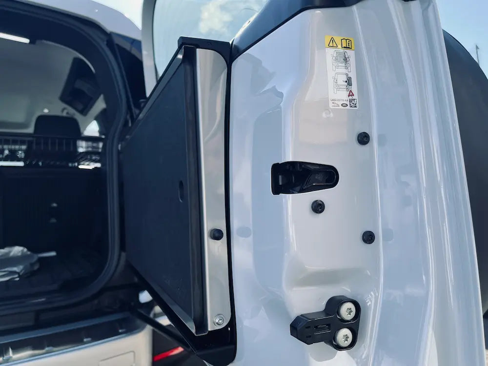 デザインは新型ディフェンダーに合わせて設計されており、一般的なアフターマーケットボルトオンテーブルとは見た目も差異のあるデザインとなっております。レーザーカットされたスチール製のバックプレートは、ディフェンダーのリアドアトリムを引き立てるブラックパウダーコーティング仕上げとなっており、ドアポケットと警告三角コンパートメントへのアクセスを妨げないよう慎重に設計されています。