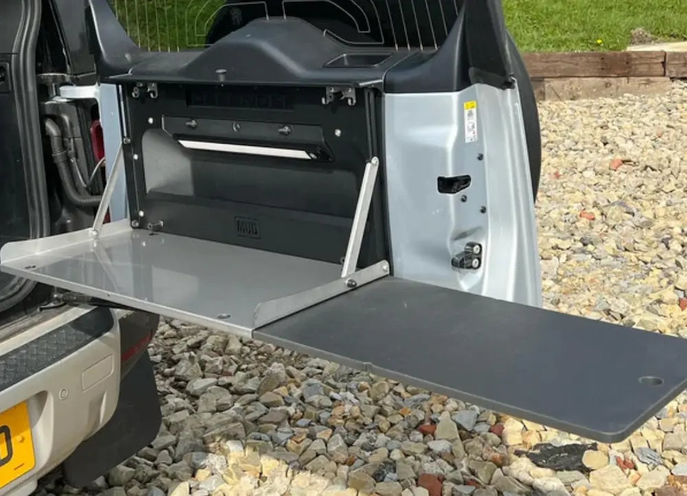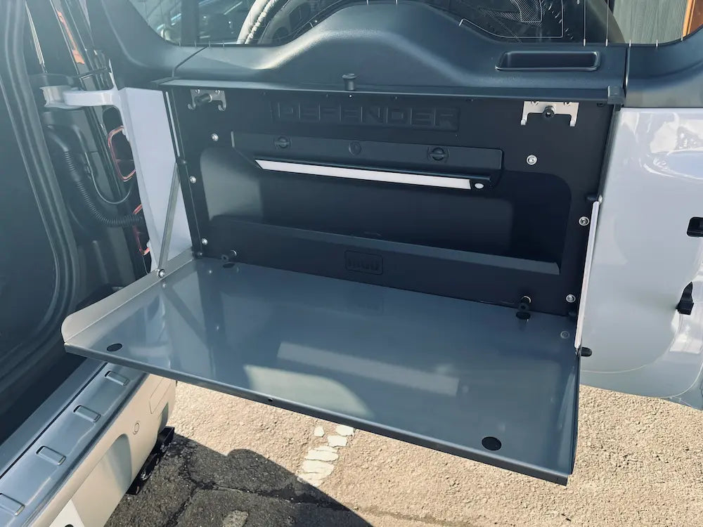 テーブルエクステンションに合板を使用するのではなく、ディフェンダーのインテリアトリム仕上げを引き立てるために選択したスレートグレー色の耐久性のある複合材料を使用しております。